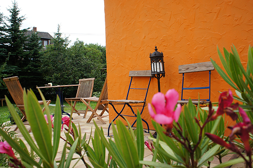 Die große Terrasse im Garten lädt zum Verweilen ein.